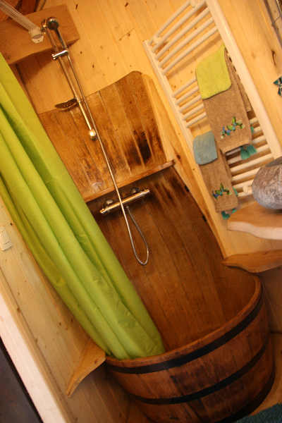 – Le petit plus de nos cabanes: Salle de bains complète dans la cabane avec douche-tonneau, sèche-cheveux, sèche-serviettes, WC traditionnels.