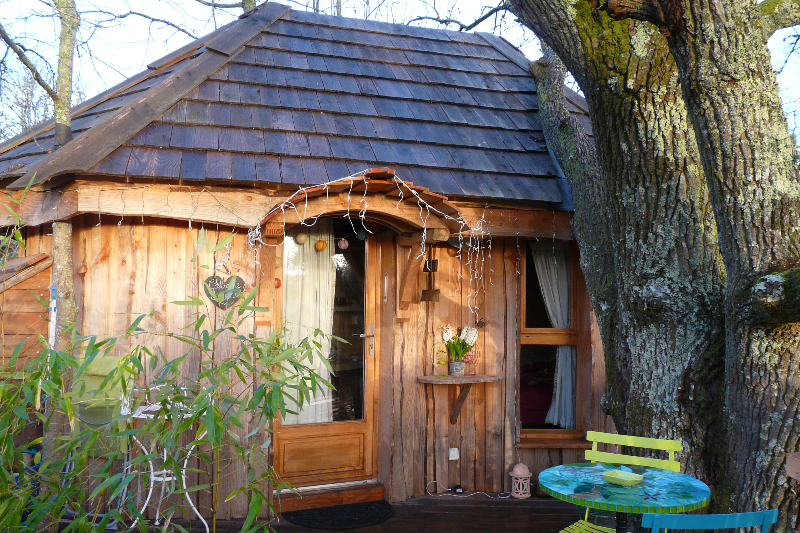 La cabane perchée Eugénie pour 2 personnes est une cabane arrondie de 16 m² construite sur un chêne centenaire accessible par un escalier en colimaçon sécurisé à 5 mètres du sol et aboutissant sur une terrasse de 20 m² surplombant une haie de bambous.